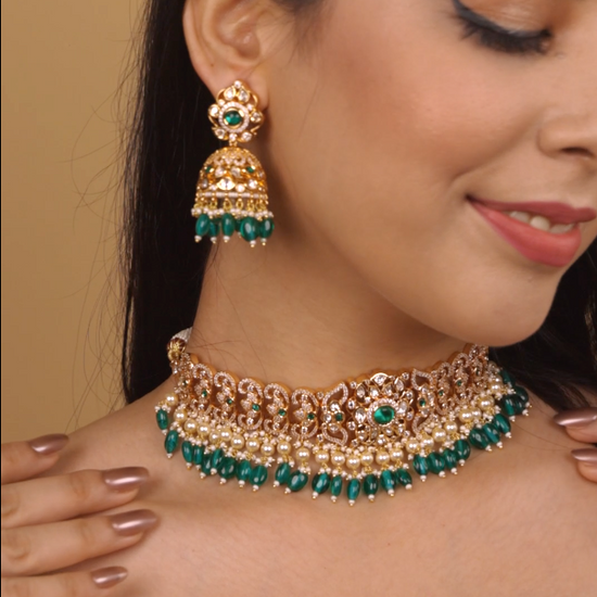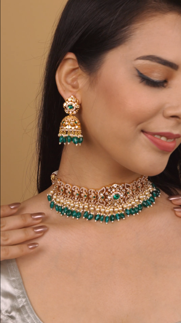Radiate confidence, elegance, and grace with the Enchanting Kundan Emerald Set. The intricate craftsmanship and sparkling stones complement every move. Completing the look with bold stud earrings, this set makes you beautiful from the inside out.